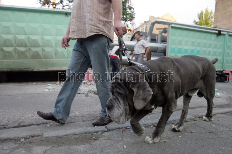 Киевлянин с собакой проходит возле стройплощадки по ул. Гончара, в Киеве, во вторник, 14 июля 2009 г. В этот день возле стройплощадки по ул. Гончара 17-23, где планируется возвести торгово-развлекательный комплекс, собрались жители микрорайона, прилегающего к строительству, также присутствовал народный депутат от НУНС Кирилл Куликов. Инициативная группа жителей демонтировала строительный забор. По нескольким решениям судов эта стройка признана незаконной, но она не прекратила работу, поэтому киевляне решили сами снести забор и тем самым приостановить незаконную стройку. Фото Владимира Гонтара / УНИАН