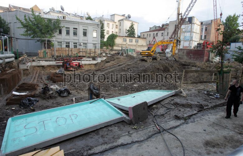 Поваленный бетонный забор на стройплощадке по ул. Гончара, в Киеве, во вторник, 14 июля 2009 г. В этот день возле стройплощадки по ул. Гончара 17-23, где планируется возвести торгово-развлекательный комплекс, собрались жители микрорайона, прилегающего к строительству, также присутствовал народный депутат от НУНС Кирилл Куликов. Инициативная группа жителей демонтировала строительный забор. По нескольким решениям судов эта стройка признана незаконной, но она не прекратила работу, поэтому киевляне решили сами снести забор и тем самым приостановить незаконную стройку. Фото Владимира Гонтара / УНИАН
