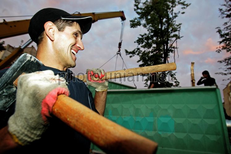 Молодой человек держит молотки во время демонтажа бетонного забора на стройплощадке по ул. Гончара, в Киеве, во вторник, 14 июля 2009 г. В этот день возле стройплощадки по ул. Гончара 17-23, где планируется возвести торгово-развлекательный комплекс, собрались жители микрорайона, прилегающего к строительству, также присутствовал народный депутат от НУНС Кирилл Куликов. Инициативная группа жителей демонтировала строительный забор. По нескольким решениям судов эта стройка признана незаконной, но она не прекратила работу, поэтому киевляне решили сами снести забор и тем самым приостановить незаконную стройку. Фото Владимира Гонтара / УНИАН