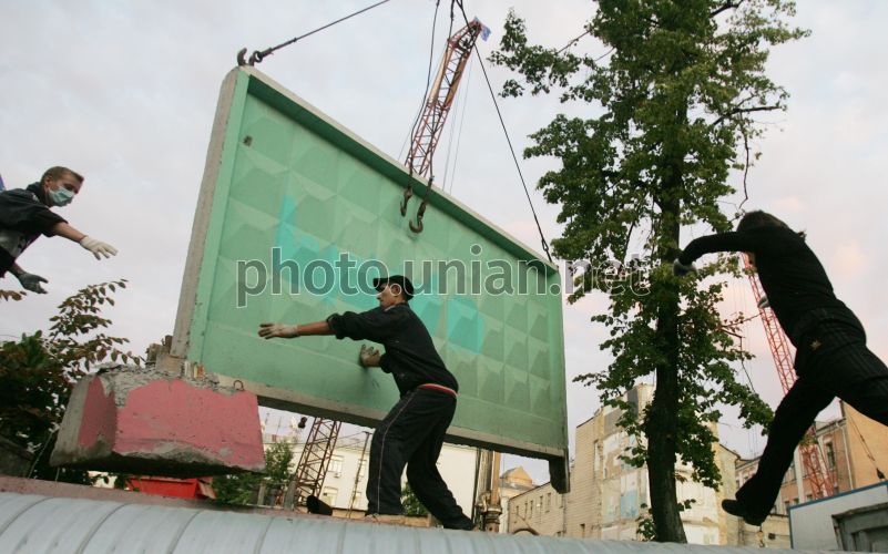 Молодые люди демонтируют с помощью подъемного крана бетонный забор на стройплощадке по ул. Гончара, в Киеве, во вторник, 14 июля 2009 г. В этот день возле стройплощадки по ул. Гончара 17-23, где планируется возвести торгово-развлекательный комплекс, собрались жители микрорайона, прилегающего к строительству, также присутствовал народный депутат от НУНС Кирилл Куликов. Инициативная группа жителей демонтировала строительный забор. По нескольким решениям судов эта стройка признана незаконной, но она не прекратила работу, поэтому киевляне решили сами снести забор и тем самым приостановить незаконную стройку. Фото Владимира Гонтара / УНИАН