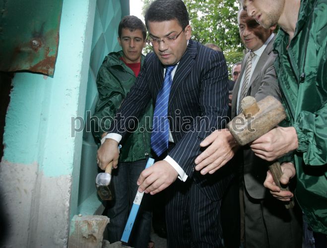 Народный депутат от фракции ”НУ-НС” Кирилл Куликов демонтирует забор возле стройплощадки по ул. Гончара, в Киеве, во вторник, 14 июля 2009 г. В этот день возле стройплощадки по ул. Гончара 17-23, где планируется возвести торгово-развлекательный комплекс, собрались жители микрорайона, прилегающего к строительству, также присутствовал народный депутат от НУНС Кирилл Куликов. Инициативная группа жителей демонтировала строительный забор. По нескольким решениям судов эта стройка признана незаконной, но она не прекратила работу, поэтому киевляне решили сами снести забор и тем самым приостановить незаконную стройку. Фото Владимира Гонтара / УНИАН