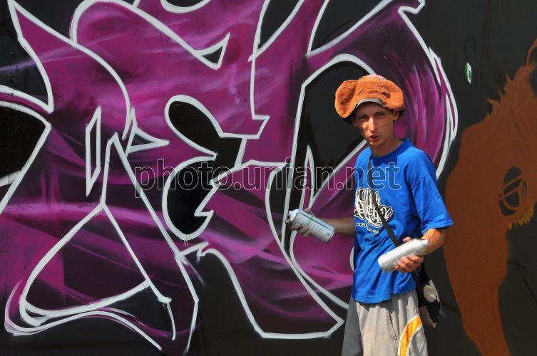 Райтер (граффити-художник) возле своего граффити, в Харькове, в субботу, 25 июля 2009г. В этот день в Харькове прошел первый фестиваль граффити Newton Street. Фестиваль собрал не только украинских мастеров граффити-искусства, но и известных райтеров из СНГ и Европы. Его результатом стали 1000 квадратных метров разрисованной стены. Считается, что искусство граффити - это одна из форм самовыражения современной молодежи. Граффити-художники называют себя райтерами (от англ. writers). Первобытные граффити можно отыскать на территории архитектурного комплекса Гиза (Египет) и поселений народа майя в Северной Америке. На египетских пирамидах обнаружены граффити, оставленные французскими солдатами во время египетской кампании Наполеона. Фото Игоря Чекачкова / УНИАН