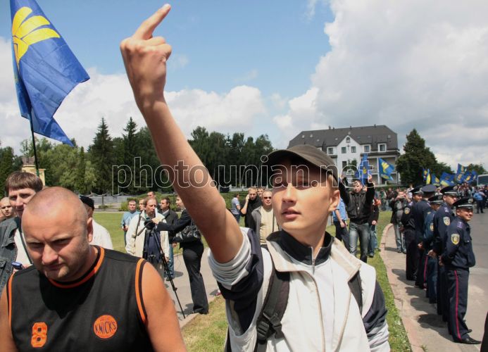 Сторонник ВО ”Свобода” показывает средний палец во время акции протеста против празднования 65-й годовщины освобождения Львова от немецко-фашистских захватчиков во Львове, в воскресенье, 27 июля 2009 г. В этот день около 100 сторонников ВО ”Свобода” провели панихиду в знак протеста против празднования 65-й годовщины освобождения Львова от немецко-фашистских захватчиков. Фото Петра Задорожного / УНИАН
