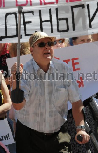 Пожилой мужчина размахивает костылем во время акции протеста вкладчиков возле здания управления Национального банка Украины в Запорожской области, в Запорожье, в понедельник, 17 августа 2009 г. В этот день активисты запорожской общественной организации «Союз защиты вкладчиков» провели акцию протеста возле здания управления Национального банка Украины в Запорожской области. По словам председателя «Союза защиты вкладчиков» Нелли Босиевой, региональные руководители проблемных банков идут с вкладчиками на контакт, предоставляют информацию, но в результате не спешат возвращать деньги. Главные требования пикетчиков – ликвидировать Акционерный коммерческий банк «Европейский» и установить точные даты расчета с вкладчиками для «Укррудпрома». Фото Александра Прилепы / УНИАН