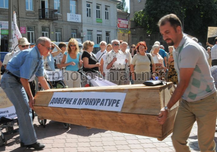 Участники акции протеста вкладчиков несут гроб к зданию управления Национального банка Украины в Запорожской области, в Запорожье, в понедельник, 17 августа 2009 г. В этот день активисты запорожской общественной организации «Союз защиты вкладчиков» провели акцию протеста возле здания управления Национального банка Украины в Запорожской области. Они требовали, чтобы в некоторых проблемных банках был начат процесс ликвидации, а в остальных установили точные даты расчета с физлицами. Кроме того, по мнению вкладчиков, необходимо установить порядок, согласно которому банки отчитались перед ними по рефинансированию. Фото Александра Прилепы / УНИАН