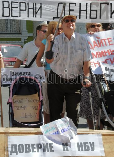 Пожилой мужчина размахивает костылем во время акции протеста вкладчиков возле здания управления Национального банка Украины в Запорожской области, в Запорожье, в понедельник, 17 августа 2009 г. В этот день активисты запорожской общественной организации «Союз защиты вкладчиков» провели акцию протеста возле здания управления Национального банка Украины в Запорожской области. Они требовали, чтобы в некоторых проблемных банках был начат процесс ликвидации, а в остальных установили точные даты расчета с физлицами. Кроме того, по мнению вкладчиков, необходимо установить порядок, согласно которому банки отчитались перед ними по рефинансированию. Фото Александра Прилепы / УНИАН