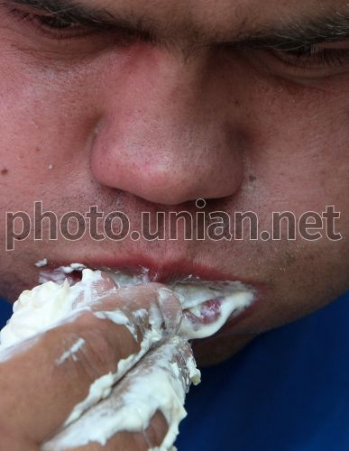 Участник Всеукраинского Чемпионата по скоростному поеданию вареников во время соревнований, в день празднования 18-ой годовщины Независимости Украины, в Киеве, в понедельник, 24 августа 2009 г. Фото Сергея Светлицкого / УНИАН