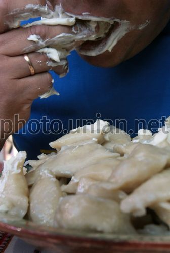 Участник Всеукраинского Чемпионата по скоростному поеданию вареников во время соревнований, в день празднования 18-ой годовщины Независимости Украины, в Киеве, в понедельник, 24 августа 2009 г. Фото Сергея Светлицкого / УНИАН