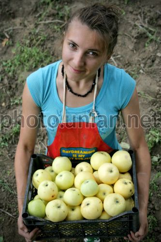 Девушка держит ящик яблок во время сбора урожая в с. Городница (Гусятинский р-н, Тернопольская обл.), во вторник, 8 сентября 2009 г. В Украине продолжается активный сезон осенне-полевых работ. Министерство аграрной политики со ссылкой на оперативные данные из регионов оценивает потребность сельскохозяйственных предприятий в финансовых средствах на проведение осенне-полевых работ в сумме 18,2 млрд. гривен, в том числе для проведения уборочной кампании - 8,8 млрд. гривен. Фото Виктора Гурняка / УНИАН
