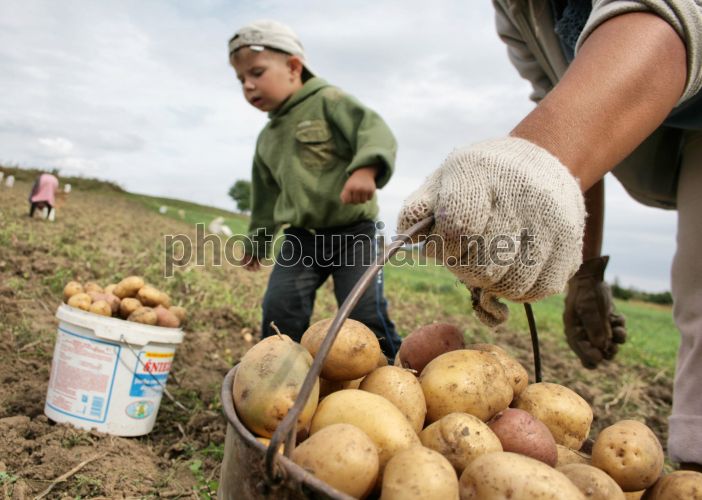 Мать с ребенком собирают выкопанный из земли картофель во время сбора урожая в с. Городница (Гусятинский р-н, Тернопольская обл.), во вторник, 8 сентября 2009 г. В Украине продолжается активный сезон осенне-полевых работ. Министерство аграрной политики со ссылкой на оперативные данные из регионов оценивает потребность сельскохозяйственных предприятий в финансовых средствах на проведение осенне-полевых работ в сумме 18,2 млрд. гривен, в том числе для проведения уборочной кампании - 8,8 млрд. гривен. Фото Виктора Гурняка / УНИАН