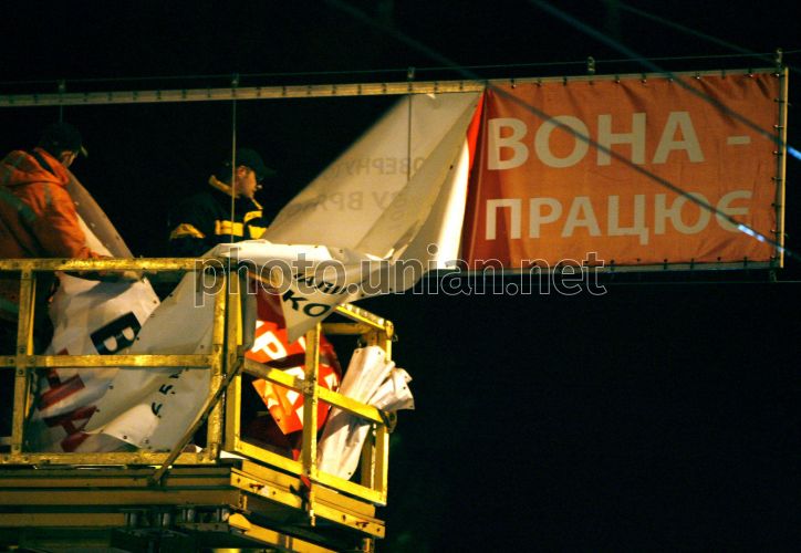Сотрудники коммунальной службы заменяют предвыборный плакат премьер-министра Украины Юлии Тимошенко на биллборде в Киеве, в пятницу, 9 октября 2009 г. Согласно результатам социологических исследований, по сравнению с июлем в 2009 г., рейтинги двух основных кандидатов на пост президента Украины лидера Партии регионов Виктора Януковича и премьер-министра Украины Юлии Тимошенко выросли на 0,9% и 2,1% соответственно, в то же время, рейтинг лидера “Фронта перемен” Арсения Яценюка упал более чем на треть (4,9%). По состоянию на начало октября, 28,7% украинцев готовы поддержать Януковича на выборах Президента. Второе место занимает Тимошенко, за нее готовы проголосовать 19% опрошенных. Все остальные вероятные кандидаты в Президенты Украины значительно уступают этим двум лидерам. В частности, за Яценюка готовы проголосовать 8,2% респондентов, за председателя Коммунистической партии Петра Симоненко – 3,6%, за спикера Верховной Рады Владимира Литвина – 2,9%, за действующего Президента Виктора Ющенко – 2,8%, за бывшего председателя Национального банка Сергея Тигипко – 2,6%, за лидера партии “Свобода” Олега Тягнибока – 1% опрошенных. Фото Андрея Скакодуба / УНИАН