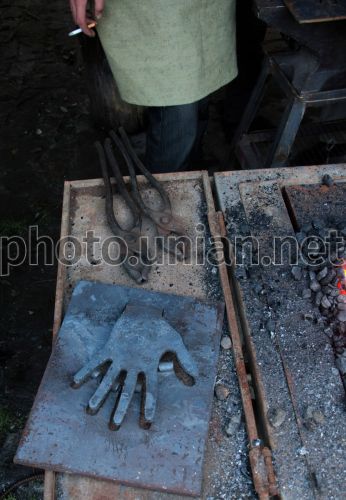 Кузнец курит, стоя возле металлической пластины, на которой вырезан контур руки, во время проведения III фестиваля кузнечного искусства ”Железный Лев - 2009”, во Львове, в пятницу, 16 октября 2009 г. В фестивале принимают участие 50 кузнецов из всех регионов Украины. Основная цель мероприятия – обмен опытом между кузнецами и популяризация кузнечества как разновидности искусства. На фестивале поставлено требование ко всем участникам - минимизировать использование технических средств. Все будет делаться вручную - с помощью горна, молота и наковальни. В рамках фестиваля также пройдет выставка кузнечных работ и научно-практическая конференция ”Художественный металл Украины: прошлое, современное, будущее”. Фестиваль будет длиться до 18 октября. Фото Петра Задорожного / УНИАН