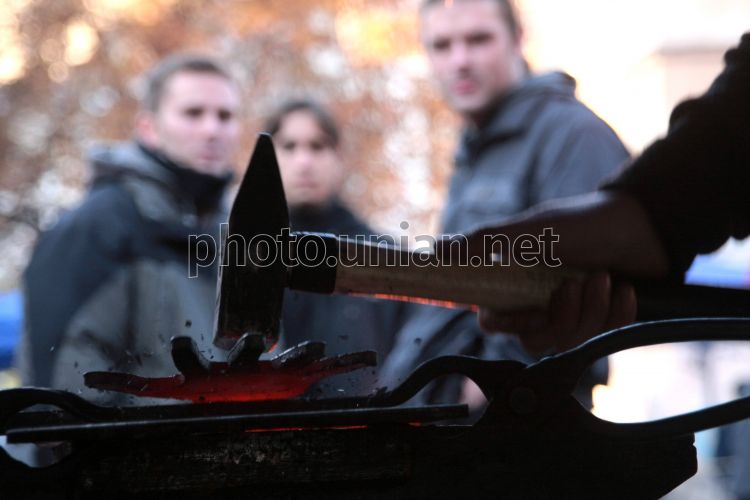 Кузнец работает с металлической пластиной, на которой вырезан контур руки, во время проведения III фестиваля кузнечного искусства ”Железный Лев - 2009”, во Львове, в пятницу, 16 октября 2009 г. В фестивале принимают участие 50 кузнецов из всех регионов Украины. Основная цель мероприятия – обмен опытом между кузнецами и популяризация кузнечества как разновидности искусства. На фестивале поставлено требование ко всем участникам - минимизировать использование технических средств. Все будет делаться вручную - с помощью горна, молота и наковальни. В рамках фестиваля также пройдет выставка кузнечных работ и научно-практическая конференция ”Художественный металл Украины: прошлое, современное, будущее”. Фестиваль будет длиться до 18 октября. Фото Петра Задорожного / УНИАН