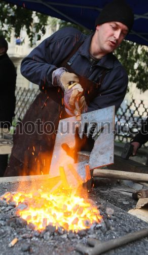 Кузнец накаливает металлическую пластину, на которой вырезан контур руки, во время проведения III фестиваля кузнечного искусства ”Железный Лев - 2009”, во Львове, в пятницу, 16 октября 2009 г. В фестивале принимают участие 50 кузнецов из всех регионов Украины. Основная цель мероприятия – обмен опытом между кузнецами и популяризация кузнечества как разновидности искусства. На фестивале поставлено требование ко всем участникам - минимизировать использование технических средств. Все будет делаться вручную - с помощью горна, молота и наковальни. В рамках фестиваля также пройдет выставка кузнечных работ и научно-практическая конференция ”Художественный металл Украины: прошлое, современное, будущее”. Фестиваль будет длиться до 18 октября. Фото УНИАН