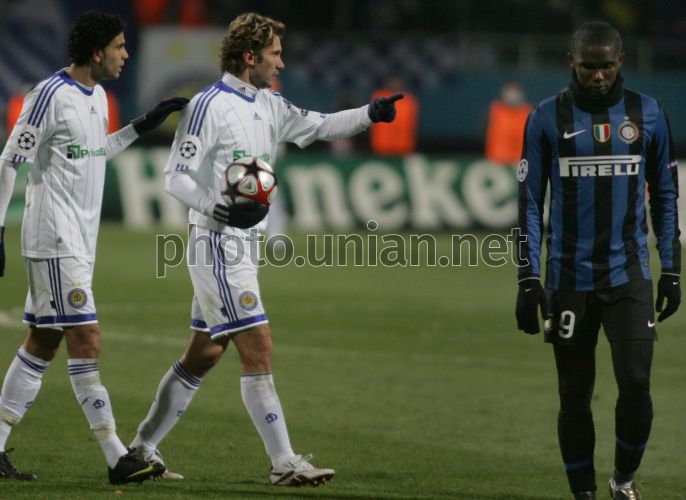 Игроки ФК ”Динамо” (Киев, Украина) полузащитник Жерсон Маграо (№21), слева, нападающий Андрей Шевченко (№7), в центре, и нападающий ФК ”Интер” (Милан, Италия) Самюэль Этоо (№9) во время матча 4-го тура Лиги Чемпионов УЕФА, в Киеве, в среду, 4 ноября 2009 г. Матч закончился со счетом 1:2 в пользу ФК ”Интер”. Фото Владимира Гонтара / УНИАН