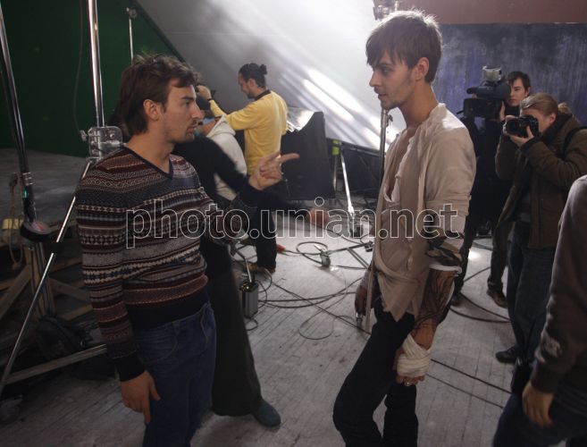 Украинский режиссер Алан Бадоев, слева, и певец Макс Барских во время съемок видеоклипа на песню «Агония», в Киеве, в четверг, 19 ноября 2009 г. Клип состоит из сложных трюков, часть которых Макс Барских исполняет самостоятельно. Для этого певцу пришлось брать уроки у профессиональных каскадеров. Фото УНИАН