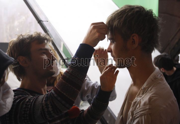 Украинский режиссер Алан Бадоев, слева, и певец Макс Барских во время съемок видеоклипа на песню «Агония», в Киеве, в четверг, 19 ноября 2009 г. Клип состоит из сложных трюков, часть которых Макс Барских исполняет самостоятельно. Для этого певцу пришлось брать уроки у профессиональных каскадеров. Фото УНИАН