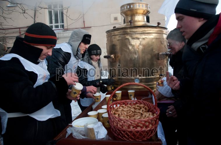 Участники акции «Согреем теплом Запорожцев» стоят в очереди за чаем, в Запорожье, во вторник, 26 января 2010 г. В этот день в центре Запорожья был установлен 300-литровый самовар и все желающие могли отведать чай с лимоном, бубликами и пряниками. Организаторы решили провести акцию в связи с сильными морозами. Фото Александра Прилепы / УНИАН