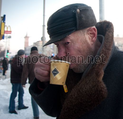Участник акции «Согреем теплом Запорожцев» пьет чай, в Запорожье, во вторник, 26 января 2010 г. В этот день в центре Запорожья был установлен 300-литровый самовар и все желающие могли отведать чай с лимоном, бубликами и пряниками. Организаторы решили провести акцию в связи с сильными морозами. Фото Александра Прилепы / УНИАН