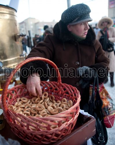 Женщина берет бублик к чаю во время акции «Согреем теплом Запорожцев», в Запорожье, во вторник, 26 января 2010 г. В этот день в центре Запорожья был установлен 300-литровый самовар и все желающие могли отведать чай с лимоном, бубликами и пряниками. Организаторы решили провести акцию в связи с сильными морозами. Фото Александра Прилепы / УНИАН
