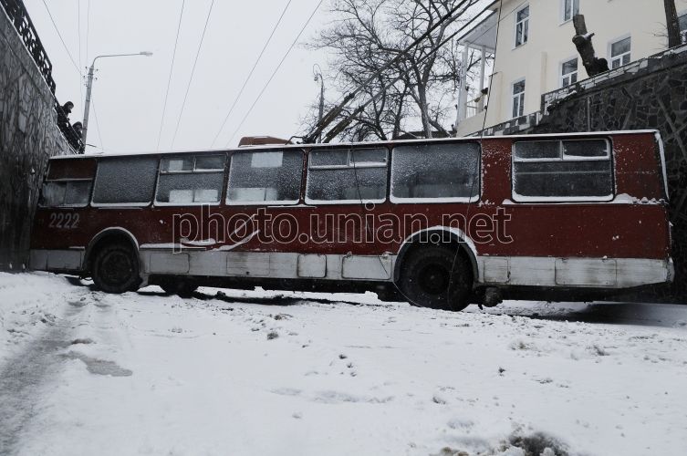 Троллейбус, водитель которого не справился с управлением на скользкой дороге стоит поперек улицы, в Севастополь (Крым), в среду, 3 февраля 2010 г. В этот день полуостров завалило снегом. В Крыму объявлено штормовое предупреждение. Синоптики прогнозируют на полуострове сильные дожди, с переходом в мокрый снег, местами очень сильные осадки, налипание мокрого снега, метелицу, гололед и гололедицу. В связи с этим повышается вероятность повреждения линий связи и электропередач в населенных пунктах, падения слабо укрепленных конструкций, деревьев, случаев травматизма среди населения. Повышается риск возникновения задержек в движении автотранспорта и возникновения автомобильных заторов на дорогах. Фото Андрея Любимова / УНИАН