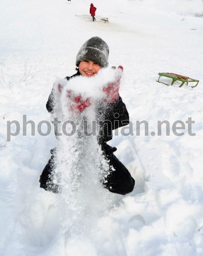 Мальчик играет снегом в Новой Каховке, в воскресенье, 7 февраля 2010 г. 8 февраля, в Украине ожидается снег, днем до 10° мороза. В центральных областях будет мокрый снег, на юге с дождем, утром и днем местами сильные осадки, налипание мокрого снега, гололед; на остальной территории местами небольшой снег. На дорогах гололедица. Ветер преимущественно восточный, 7-12 м/с, в восточных, центральных областях и южной части местами порывы 15-20 м/с, метели. Температура ночью 11-16°, днем 5-10° мороза; на Закарпатье, в южных областях и Приазовье ночью 4-9° мороза, днем от 1° мороза до 4° тепла; в Крыму ночью около 0°, днем 5-10° тепла. 8 февраля в Киеве и Киевской области ночью без осадков, днем небольшой снег. На дорогах гололедица. Ветер восточный, 7-10 м/с. Температура по области ночью 11-16°, днем 5-10° мороза, в Киеве - ночью 11-13°, днем 6-8° мороза. Фото УНИАН