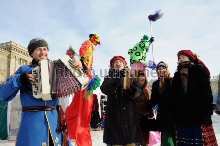 Музыканты во время городской ярмарки, посвященная празднованию Масленицы, в Харькове, в пятницу, 12 февраля 2010 г. Масляная (Масленицы, Масленица, сырное воскресенье) – древнеславянский праздник в честь весеннего пробуждения природы. После крещения Руси Масленица празднуется в последнюю неделю перед Великим постом, за семь недель до Пасхи. Главными атрибутами праздника являются блины и народные гуляния. Христианская церковь включила Масленицу в свой календарь, однако она так и не приобрела религиозного содержания. Фото Игоря Чекачкова / УНИАН