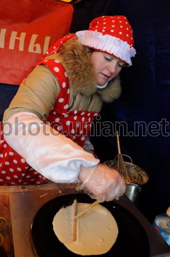 Девушка готовит блины во время городской ярмарки, посвященная празднованию Масленицы, в Харькове, в пятницу, 12 февраля 2010 г. Масляная (Масленицы, Масленица, сырное воскресенье) – древнеславянский праздник в честь весеннего пробуждения природы. После крещения Руси Масленица празднуется в последнюю неделю перед Великим постом, за семь недель до Пасхи. Главными атрибутами праздника являются блины и народные гуляния. Христианская церковь включила Масленицу в свой календарь, однако она так и не приобрела религиозного содержания. Фото Игоря Чекачкова / УНИАН