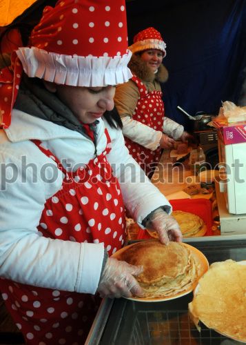 Участница городской ярмарки, посвященная празднованию Масленицы, перекладывает блины на блюдо в Харькове, в пятницу, 12 февраля 2010 г. Масляная (Масленицы, Масленица, сырное воскресенье) – древнеславянский праздник в честь весеннего пробуждения природы. После крещения Руси Масленица празднуется в последнюю неделю перед Великим постом, за семь недель до Пасхи. Главными атрибутами праздника являются блины и народные гуляния. Христианская церковь включила Масленицу в свой календарь, однако она так и не приобрела религиозного содержания. Фото Владимира Андреева / УНИАН