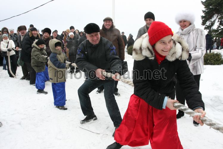 Дети перетягивают канат во время ярмарки, по случаю празднования Масленицы, в Днепропетровске, в субботу, 13 февраля 2010 г. Масляная (Масленицы, Масленица, сырное воскресенье) – древнеславянский праздник в честь весеннего пробуждения природы. После крещения Руси Масленица празднуется в последнюю неделю перед Великим постом, за семь недель до Пасхи. Главными атрибутами праздника являются блины и народные гуляния. Христианская церковь включила Масленицу в свой календарь, однако она так и не приобрела религиозного содержания. Фото Сергея Исаева / УНИАН