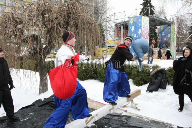 Молодые люди в украинских национальных костюмах бьются мешками во время ярмарки по случаю празднования Масленицы, в Днепропетровске, в субботу, 13 февраля 2010 г. Масляная (Масленицы, Масленица, сырное воскресенье) – древнеславянский праздник в честь весеннего пробуждения природы. После крещения Руси Масленица празднуется в последнюю неделю перед Великим постом, за семь недель до Пасхи. Главными атрибутами праздника являются блины и народные гуляния. Христианская церковь включила Масленицу в свой календарь, однако она так и не приобрела религиозного содержания. Фото Сергея Исаева / УНИАН