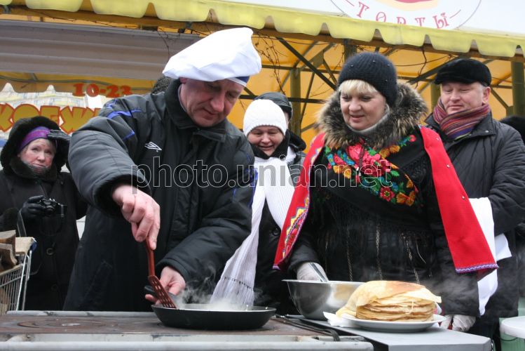 Мэр Днепропетровска Иван Куличенко, слева, жарит блины во время ярмарки по случаю празднования Масленицы, в Днепропетровске, в субботу, 13 февраля 2010 г. Масляная (Масленицы, Масленица, сырное воскресенье) – древнеславянский праздник в честь весеннего пробуждения природы. После крещения Руси Масленица празднуется в последнюю неделю перед Великим постом, за семь недель до Пасхи. Главными атрибутами праздника являются блины и народные гуляния. Христианская церковь включила Масленицу в свой календарь, однако она так и не приобрела религиозного содержания. Фото Сергея Исаева / УНИАН
