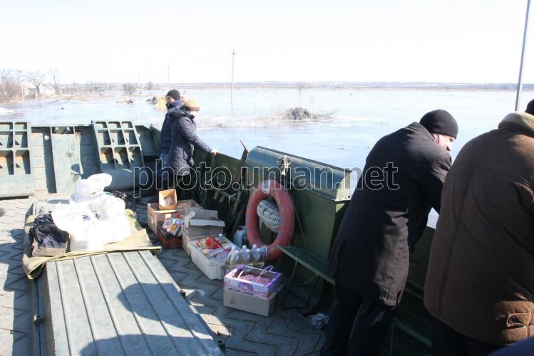 Продукты питания в плавающем транспортере среднем (ПТС) для жителей с. Спасское (Днепропетровская обл.), в среду, 10 марта 2010 г. В Днепропетровской области 2 марта река Кильчень вышла из берегов, в результате чего отрезанными от сообщения оказались 300 дачных участков и 74 усадьбы. «В Днепропетровском районе речными водами затопило дорогу через реку Кильчень, отрезаны около 300 дачных участков, затруднено движение по основной дороге и на пути в полевой лагерь воинской части. Мост через реку Кильчень накрыло водой, на данный момент он остается подтопленным. Также вода стоит в окрестностях села Победа и в пригороде Подгородного. В Новомосковском районе из-за затопления речными водами остаются отрезанными от сообщения 74 усадьбы села Спасское», – сообщает пресс-служба МЧС. Кроме того, в Днепропетровской области подтоплены 119 усадеб, 175 погребов (подвалов). В Криворожском районе Днепропетровской области грунтовыми водами подтоплены одна усадьба и 175 погребов - в селах Радушное, Красное, Калинино, Красино, Новополье. К ликвидации подтоплений от Госводхоза, коммунальных служб и МЧС привлечены 100 человек и 33 единицы техники, в том числе 45 спасателей с 22-мя единицами техники. В селе Спасское сотрудники МЧС доставляют продукты питания местным жителям на плавающем транспортере среднем, на нем же развозят детей в школу. Фото Сергея Исаева / УНИАН