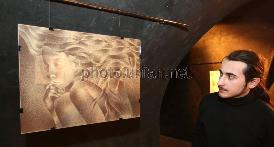 Художник Мирон Катаран рассматривает свою картину на выставке “Masky” , во Львове, в среду, 10 марта 2010 г. Фото УНИАН