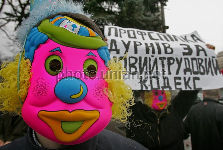 Участник театрализованной акции протеста «Профсоюз дураков» в маске клоуна во время митинга против нового „Трудового кодекса” возле здания Верховной Рады Украины, в Киеве, в четверг, 1 апреля 2010 г. Участники акции, изображающие «дураков», вышли на митинг для атаки народных депутатов с требованием увеличить рабочий день работников до 12 часов, повысить пенсионный возраст и т.д. Таким образом участники акции выразили протест против нового „Трудового кодекса”, который ограничивает права трудящихся. Фото Александра Синицы / УНИАН