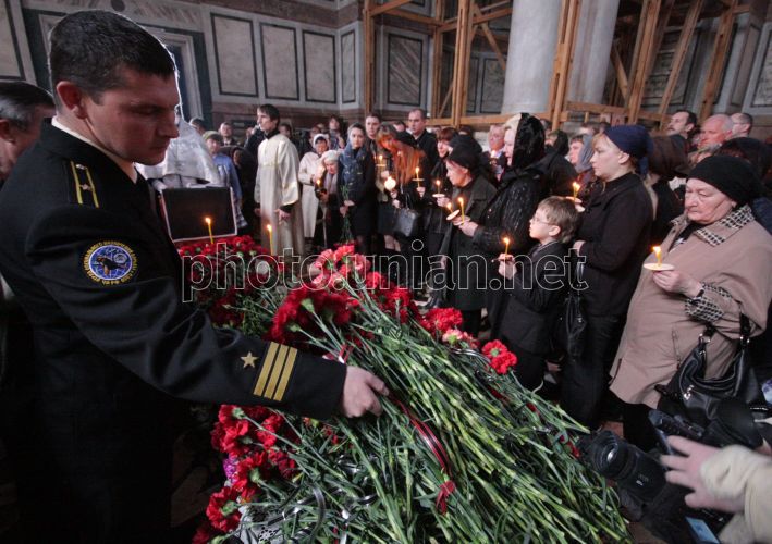 Участники церемонии похорон капитана первого ранга Черноморского флота России Виктора Гинькута, погибшего 29 марта в результате теракта в Москве на станции метро ”Парк культуры”, в Севастополе (Крым), в пятницу, 2 апреля 2010 г. Погибший имел также российское гражданства. Ввиду того, что украинское законодательство не предусматривает двойного гражданства, консульство рассматривает его как гражданина Украины. 29 марта в московском метрополитене произошли взрывы на станциях “Лубянка” и “Парк культуры”. В результате взрывов погибли 39 человек. Фото Алексея Сувирова / УНИАН
