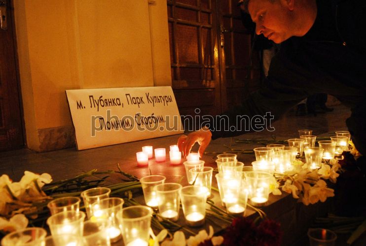 Горящие свечи возле таблички с надписью ”м. Лубянка, Парк Культуры. Помним. Скорбим” во время акции ”Зажги свечу памяти” в память о жертвах террористических актов в московском метро на площади Нахимова, в Севастополе, во вторник, 6 апреля 2010 г. В понедельник, 29 марта 2010 г. около 07.55 и 08.40 на двух станциях линии московского метро - Сокольнической произошли взрывы: на ”Лубянке” взрыв произошел во втором вагоне от головы поезда, на ”Парке культуры” - в пятом вагоне от хвоста поезда. Взрывы совершили террористки-смертницы. Число погибших в результате терактов в московском метро - 40 человек. Ранения и травмы при взрывах получили свыше 80 человек. В результате терактов в московском метро погиб также житель Севастополя. Фото Андрея Любимова / УНИАН
