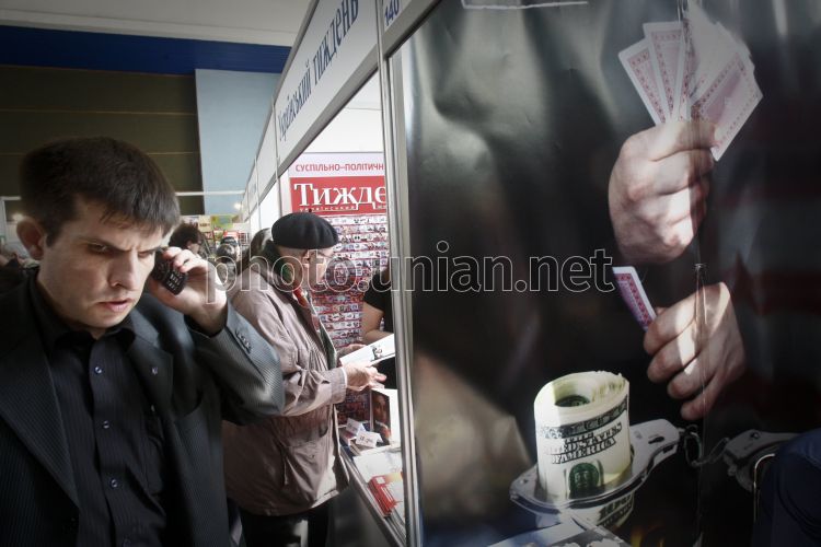 Посетитель V Весенней книжной ярмарке-фестивале разговаривает по мобильному телефону в Киеве, в четверг, 8 апреля 2010 г. В рамках книжной ярмарки, которая проходит с 8 по 11 апреля, состоится международная ассамблея фантастики ”Портал”, международный фестиваль христианской книги и первая специальная международная экспозиция спортивной книги. Фото Сергея Светлицкого / УНИАН