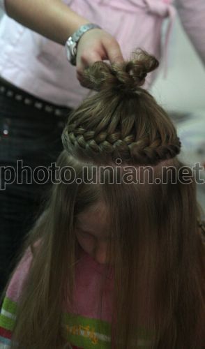 Художник-стилист Антонина Меркушева делает прическу посетительнице Книжной ярмарки, в Киеве, в субботу, 10 апреля 2010 г. Во время Книжной ярмарки состоялась презентация Первого в Украине проекта „Литературная прическа”, в рамках которого прошел показ литературной коллекции причесок и галереи моделей. Фото УНИАН