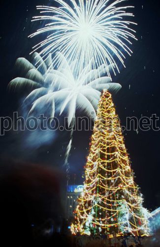 Новогодний салют в центре Киева в первые минуты нового тысячелетия в понедельник, 1 января 2001г.