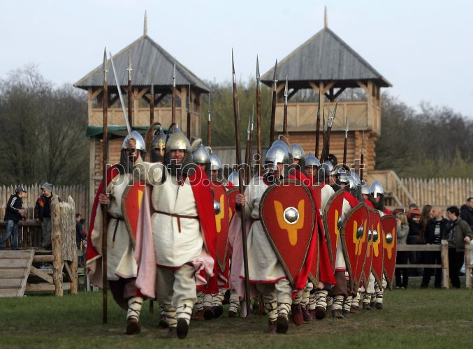Участники в доспехах древнерусских воинов на торжественном открытии III Международного фестиваля культуры и истории ”Парк Киевская Русь”, в с. Копачев (Обуховский р-н, Киевская обл.), в субботу, 24 апреля 2010 г. По словам организаторов, в этом году фестиваль будет проходить с 24 апреля по 17 октября 2010 г.г. По словам президента благотворительной организации ”Славянский фонд”, автора проекта ”Парк Киевская Русь”, в настоящий момент в парке воссоздается довладимировская эпоха, в ближайшие 1,5-2 года будут воссозданы Михайловские и Софиевские Ворота, ограждения и внутреннее наполнение довладимировской эпохи. Следующий фестиваль Парка - ”Киевская Русь XIII века” состоится 22-23 мая 2010 г. Ожидается, что гостями фестиваля станут представители культурной, научной, дипломатической и бизнес-элиты Украины, СНГ и Европы. В течение года в рамках фестиваля пройдут богатырские битвы ХІ, ХІІ и ХV вв., рыцарские турниры, День Киева, День Ярила, Медовый спас, фестиваль каскадеров, встреча “бабьего лета”, турнир лучников и другие зрелищные мероприятия. Кроме фестивальных дней, насыщенную развлекательную программу парк предложит посетителям каждые субботу и воскресенье. Центр культуры и истории ”Парк Киевская Русь” создается в 34 км от Киева. Целью проекта является воссоздание Детинца Киева V-XIII веков в масштабе 1:1 с максимальной исторической достоверностью и атмосферой Киевской Руси. Общая площадь парка – 50 га. Территория Детинца – 10 га. Эксперты называют ”Парк Киевская Русь” культурной столицей восточнославянской цивилизации. Создатели же прогнозируют, что после окончания строительства ”Парк Киевская Русь” станет туристической меккой Украины, и будет принимать до 3 млн. посетителей в год со всего мира. Фото Александра Синицы / УНИАН