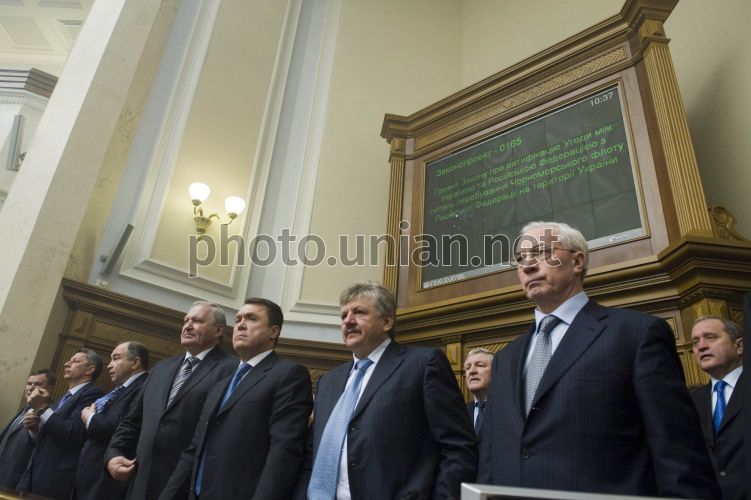Члены правительства во главе с премьер-министром Украины Николаем Азаровым, справа, во время голосования за ратификацию соглашения о продлении пребывания ЧФ РФ в Крыму, в Киеве, во вторник, 27 апреля 2010 г. За принятие соответствующего решения проголосовали 236 народных депутатов. С непродолжительным докладом по этому вопросу выступил первый вице-премьер-министр Украины. Он напомнил, что соответствующее соглашение было подписано президентами Украины и России в Харькове 21 апреля. Фото Анастасии Сироткиной / УНИАН