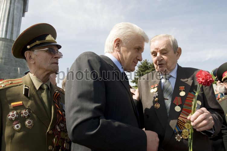 Председатель Верховной Рады Украины Владимир Литвин, в центре, общается с ветеранами Великой Отечественной войны во время церемонии возложения гирлянды Военной Славы и зажжения Огня Славы на территории Национального музея истории Великой Отечественной войны 1941-1945 гг. в Киеве, в пятницу, 7 мая 2010 г. В торжественных мероприятиях принял участие Президент Украины. Собравшиеся почтили память павших в боях за Родину минутой молчания. Фото Анастасии Сироткиной / POOL / УНИАН