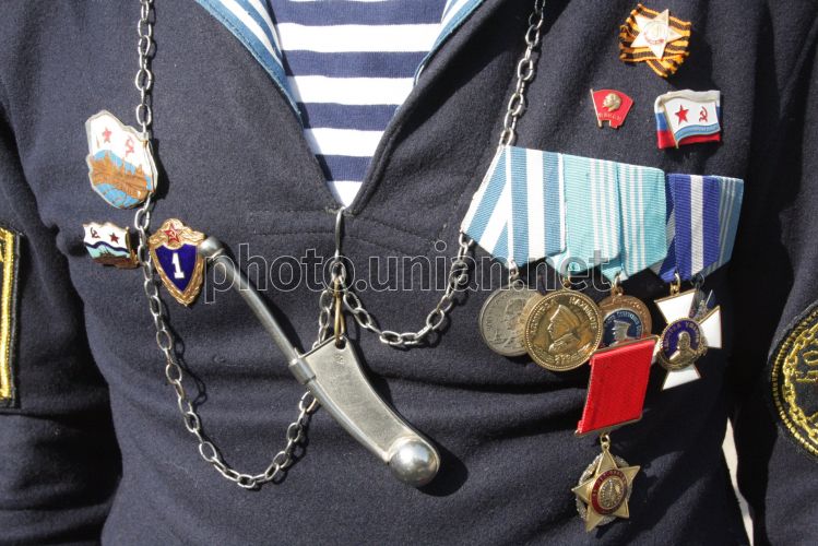 Значки и медали на груди моряка во время праздничных мероприятий по случаю 65-й годовщины Победы в Великой Отечественной войне, в Севастополе (Крым), в воскресенье, 9 мая 2010 г. В центре Севастополя более 50 тысяч человек - участников Парада Победителей, прохождения войск гарнизона, жители и гости города - приняли участие в праздновании 65-й годовщины Победы в Великой Отечественной войне и 66-й годовщины освобождения города от немецко-фашистских захватчиков. Фото Алексея Сувирова / УНИАН