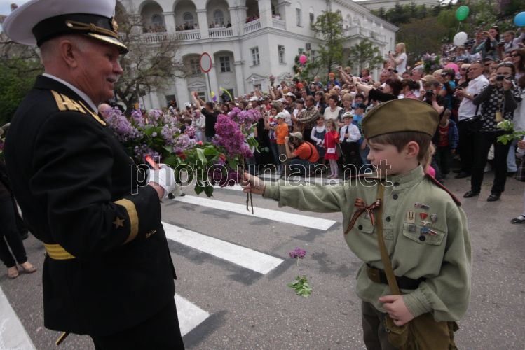 Мальчик в форме солдата времен ВОВ вручает сирень ветерану ВОВ во время праздничных мероприятий по случаю 65-й годовщины Победы в Великой Отечественной войне, в Севастополе (Крым), в воскресенье, 9 мая 2010 г. В центре Севастополя более 50 тысяч человек - участников Парада Победителей, прохождения войск гарнизона, жители и гости города - приняли участие в праздновании 65-й годовщины Победы в Великой Отечественной войне и 66-й годовщины освобождения города от немецко-фашистских захватчиков. Фото Алексея Сувирова / УНИАН