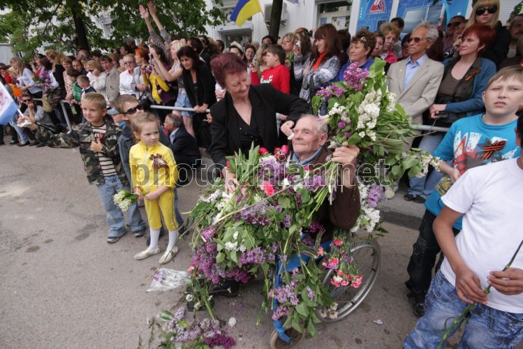 Ветеран Великой Отечественной войны в инвалидной коляске во время парада Победителей по случаю 65-й годовщины Победы в Великой Отечественной войне, в Севастополе (Крым), в воскресенье, 9 мая 2010 г. В центре Севастополя более 50 тысяч человек - участников Парада Победителей, прохождения войск гарнизона, жители и гости города - приняли участие в праздновании 65-й годовщины Победы в Великой Отечественной войне и 66-й годовщины освобождения города от немецко-фашистских захватчиков. Фото Алексея Сувирова / УНИАН