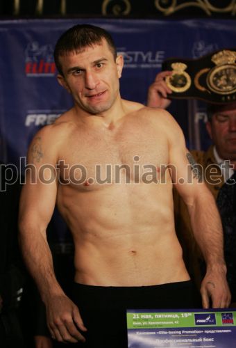 Грузинский средневес Автандил Хурцидзе (72,9 кг) во время официальной церемонии взвешивания накануне боя против венгра Михали Котая за звание интерконтинентального Чемпиона по версии WBA, в Киеве, в четверг, 20 мая 2010 г. Турнир состоится 21 мая. Фото Владимира Гонтара / УНИАН