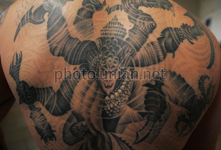 Участник VI Международного фестиваля тату и пирсинга «Tattoo- Collection/2010» демонстрирует татуировку в Киеве, в пятницу, 21 мая 2010 г. Ежегодный фестиваль татуировки и пирсинга – это площадка, где соревнуются в своём умении десятки мастеров, собираются тысячи любителей и почитателей этого искусства, а также производится выставка-продажа оборудования для тату и пирсинга как отечественных, так и зарубежных фирм-производителей. Фото Владимира Гонтара / УНИАН