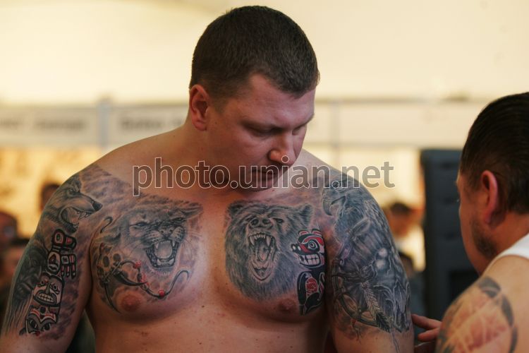 Участник VI Международного фестиваля тату и пирсинга «Tattoo- Collection/2010» демонстрирует татуировку в Киеве, в пятницу, 21 мая 2010 г. Ежегодный фестиваль татуировки и пирсинга – это площадка, где соревнуются в своём умении десятки мастеров, собираются тысячи любителей и почитателей этого искусства, а также производится выставка-продажа оборудования для тату и пирсинга как отечественных, так и зарубежных фирм-производителей. Фото Владимира Гонтара / УНИАН