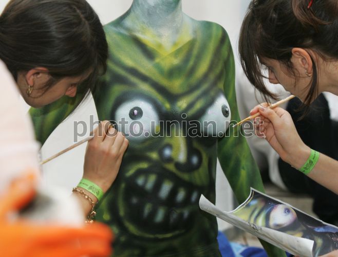 Участники VI Международного фестиваля тату и пирсинга «Tattoo- Collection/2010» наносят рисунок на тело девушки в Киеве, в пятницу, 21 мая 2010 г. Ежегодный фестиваль татуировки и пирсинга – это площадка, где соревнуются в своём умении десятки мастеров, собираются тысячи любителей и почитателей этого искусства, а также производится выставка-продажа оборудования для тату и пирсинга как отечественных, так и зарубежных фирм-производителей. Фото Владимира Гонтара / УНИАН